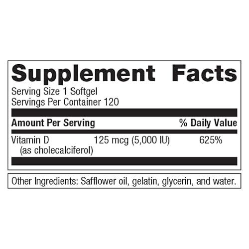 Vitamin D3 Supplement: Each softgel of Metagenics D3 5000 features 125 mcg (5,000 IU) of vitamin D3