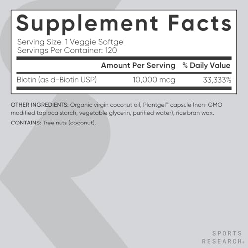Specification: Sports Research® Biotin 10,000mcg with Organic Coconut Oil – Biotin (Vitamin B7) for Healthy Skin and Hair Support* – for Women and Men – Vegan, Non-GMO, Gluten & Soy-Free – 120 Veggie Softgels